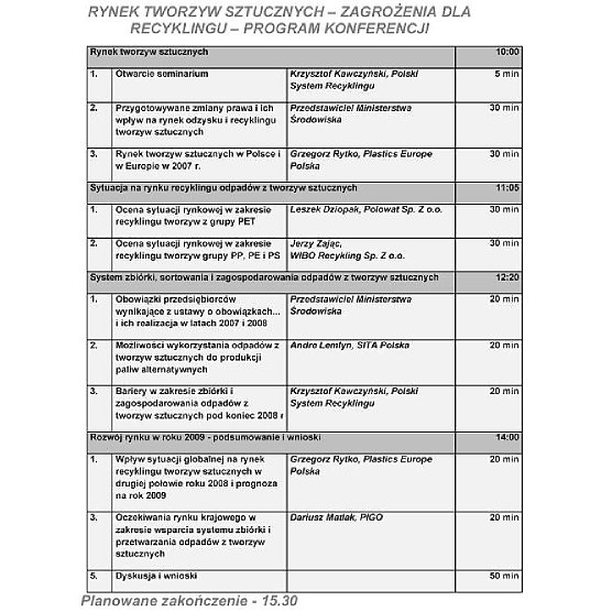 W związku z powyższym Polski System Recyklingu Organizacja Odzysku SA wraz z Fundacją Plastics Europe Polska pod patronatem miesięcznika Recykling organizuje 29 stycznia 2009 w Kazimierzu Dolnym konferencję „Rynek tworzyw sztucznych - zagrożenia dla recyklingu”.