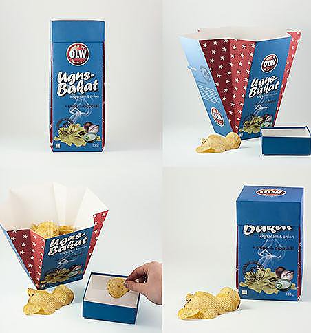 Jessica Bergdahl, Moa Ahlström i Linnea Löfgren, studenci pierwszego roku w Nackademin w Sztokholmie, stworzyli trójfunkcyjne opakowanie do chipsów. Wyróżniony projekt chroni zawartość lepiej niż tradycyjna paczka, a do tego może być także rozłozkładany i pełnić funkcję miski. Dodatkowo pokrywa, która jest wykorzystywana do zamykania opakowania, może być również używana do podowania dipów. Każde opakowanie, które może zaoferować kilka funkcji jednocześnie, jest zawsze ciekawsze i sprawia, że produkt sprzedaje się znacznie lepiej.