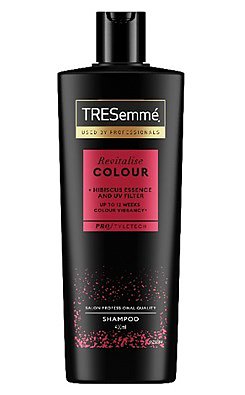 TRESemmé Revitalise Colour to szampon do włosów farbowanych, który delikatnie oczyszcza włosy i pomaga utrzymać ich intensywny kolor na dłużej – nawet do 12 tygodni! Wzbogacony o filtr UV i ekstrakt z hibiskusa chroni włosy przed promieniowaniem i nadaje im zdrowy blask. Kosmetyk został oparty na innowacyjnej technologii PRO Style ™ z kompleksem aminokwasów, które pomagają wzmocnić i chronić wewnętrzną strukturę włosów oraz ceramidami ułatwiającymi ich układanie i zapobiegającymi łamaniu. Dzięki tym składnikom włosy stają się silniejsze i pełne blasku.