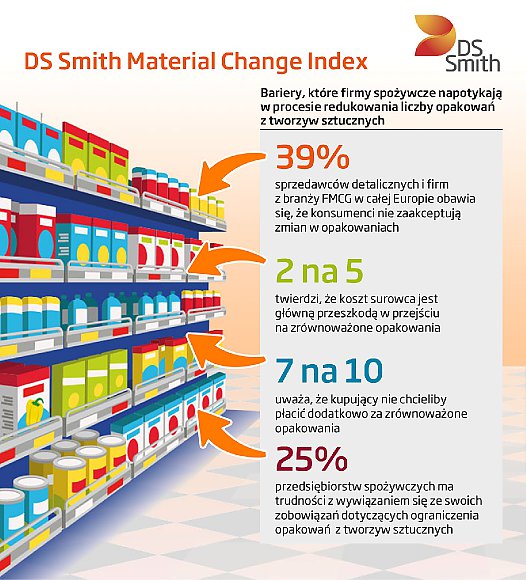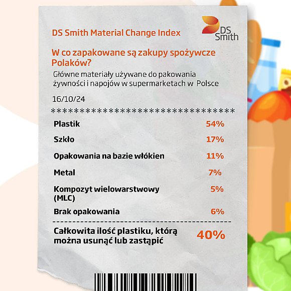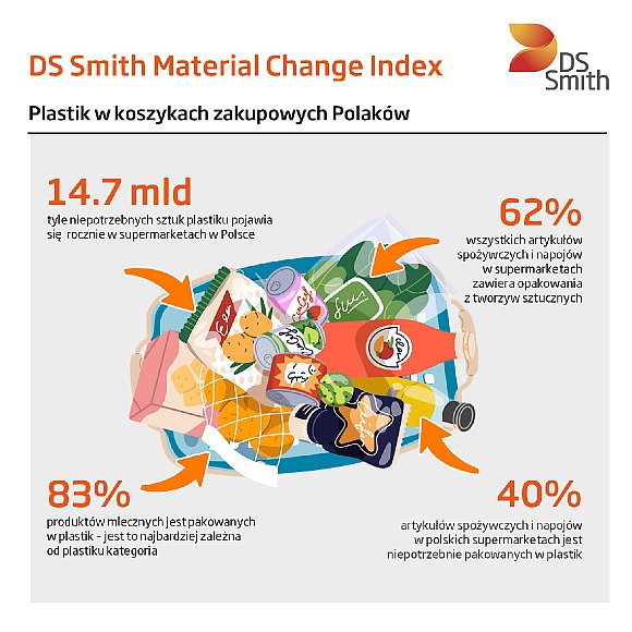 Wyniki badania „Material Change Index”, przeprowadzonego przez Retail Economics na zlecenie DS Smith, lidera w dziedzinie zrównoważonych opakowań, pokazują, że półki sklepowe wręcz uginają się od produktów w opakowaniach z tworzyw sztucznych. W polskich supermarketach 62% opakowań żywności i napojów zawiera tworzywa sztuczne, a w przypadku 40% plastik można usunąć lub zastąpić bardziej zrównoważonymi alternatywami. Oznacza to, że rocznie w Polsce w samych supermarketach pojawia się do 14,7 miliarda niepotrzebnych sztuk plastiku, z czego większość dotyczy segmentów produktów mlecznych (83%), mięsa i ryb (80%), napojów bezalkoholowych (77%) oraz pieczywa, ryżu i produktów zbożowych (76%).