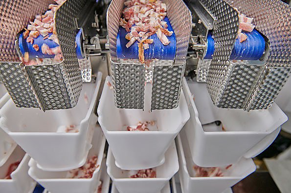Pierwszy z operatorów dostarcza słoninę na szczyt wagi, gdzie drugi operator rozdziela ją na rząd podajników taśmowych. Te z kolei automatycznie przenoszą produkt do lejów wagowych. Waga w ułamku sekundy wybiera kombinację zbiorników, których łączna waga jest najbliższa docelowej wadze 150 g. Słonina jest następnie przenoszona przez system dystrybucji tacek, które są następnie umieszczane na przenośniku taśmowym w celu uszczelnienia i detekcji pod kątem obecności metalu.