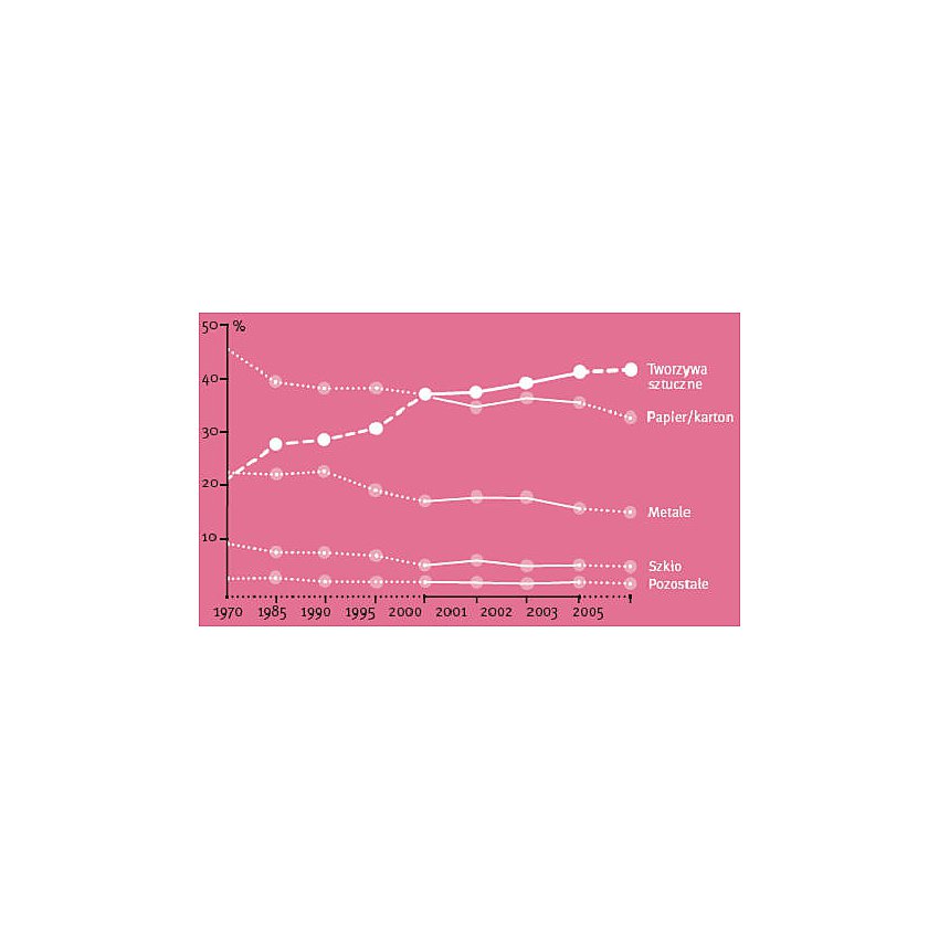 Udział różnych materiałów na niemieckim rynku opakowań w procentach wartości produkcji. Podobna tendencja występuje w innych krajach europejskich