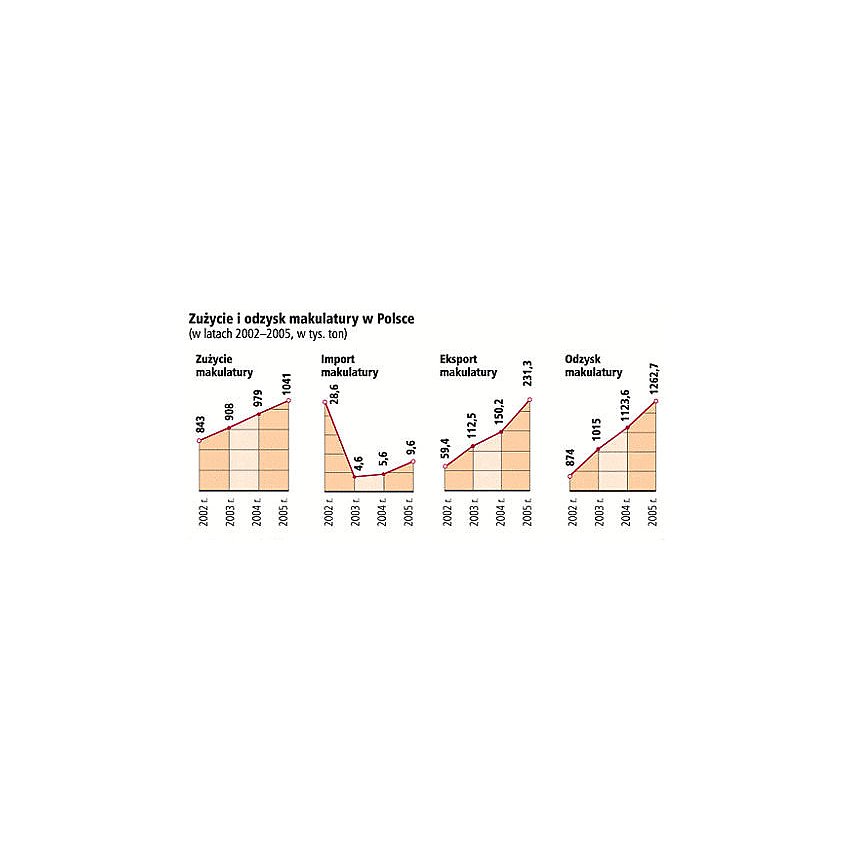Część makulatury eksportujemy do Niemiec i Austrii. Łącznie rocznie od kilku lat sprzedajemy za granicą około 230 tys. ton. Niewielkie ilości makulatury także importujemy z Francji i Czech. Jest to rocznie od 9 tys. do 10 tys ton. Handel zagraniczny makulaturą odbywa sie najczęściej za pośrednictwem producentów papieru. Zdecydowana większość z nich ma zagraniczne powiązania kapitałowe lub są w całości w posiadaniu inwestorów zagranicznych. W Polsce udział makulatury w produkcji rożnego rodzaju papieru wynosi blisko 32 proc., udział zaś mas pierwotnych (tworzonych bezpośrednio z drewna) w produkcji papieru i tektury wynosi około 55 proc., reszta to surowce niewłókniste. Pocieszającym faktem jest to, że w ubiegłym roku odnotowano w Polsce wzrost zużycia papieru i tektury z odzysku (makulatury) o 6,3 proc. Nastąpił też o 12,4 proc. wzrost odzysku makulatury z rynku odpadów i wzrost jej eksportu aż o 54 proc. Ze względu na wzrost pozysku makulatury w Polsce, w 2004 i w 2005 roku nie występowały problemy z zaopatrzeniem papierni w surowiec wtórny i praktycznie nie zostały wykorzystane zezwolenia na uzupełniający import makulatury. Najwięcej w produkcji papieru i tektury wykorzystano makulatury z tektury falistej i mocnej (56,3 proc.), z gazet i czasopism (25,7 proc.) oraz mieszanej (9,8 proc.). Odmiany wyższej jakości stanowiły tylko 8,1 proc. Najwięcej odzyskano i zużyto w przemyśle papierniczym makulatury opakowaniowej.