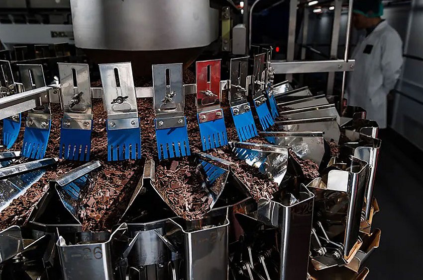 Płatki czekolady są przenoszone na środkowy poziom, gdzie Ishida CCW-RV waży je do wymaganych wielkości porcji, zanim spadną do najniższego poziomu w celu zapakowania i inspekcji".