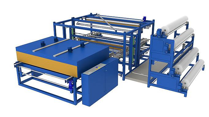 Osadzony na jednej ramie tunel obkurczający z maszyną owijającą w tuleję z taśmy folii termokurczliwej. Maszyna przystosowana do pracy ciągłej w linii produkującej różne długie artykuły typu: świetlówki, listwy podłogowe, rurki, karnisze, deski, itp. (długość od 600 mm do 2000 mm). Po przejęciu pakietów pobieranych przez manipulator z linii produkcyjnej lub magazynu, produkt podawany jest na specjalnie zaprojektowane napędzane kieszenie-wózki. Owinięcie pakietu tuleją folii i zgrzew odbywa się wzdłuż produktu. Zastosowano zgrzewadło kroczące, co pozwala na uzyskanie dużych wydajności. Cały proces pakowania odbywa się w pełni automatycznie. Zastosowane serwonapędy pozwalają na optymalizację procesu pakowania. Uzyskana wydajność do 50 pakietów/min. Atutem maszyny jest szybka możliwość zmiany długości pakowanego pakietu. Czas przezbrojenia max 30 min. Zastosowano boczne podawanie folii z magazynkiem na dodatkowe rolki folii. Specjalny zmechanizowany rozdzielacz folii podaje folię pod zgrzewadło pod katem 90 stopni. Umożliwia to na zmianę folii w trakcie procesu pakowania.